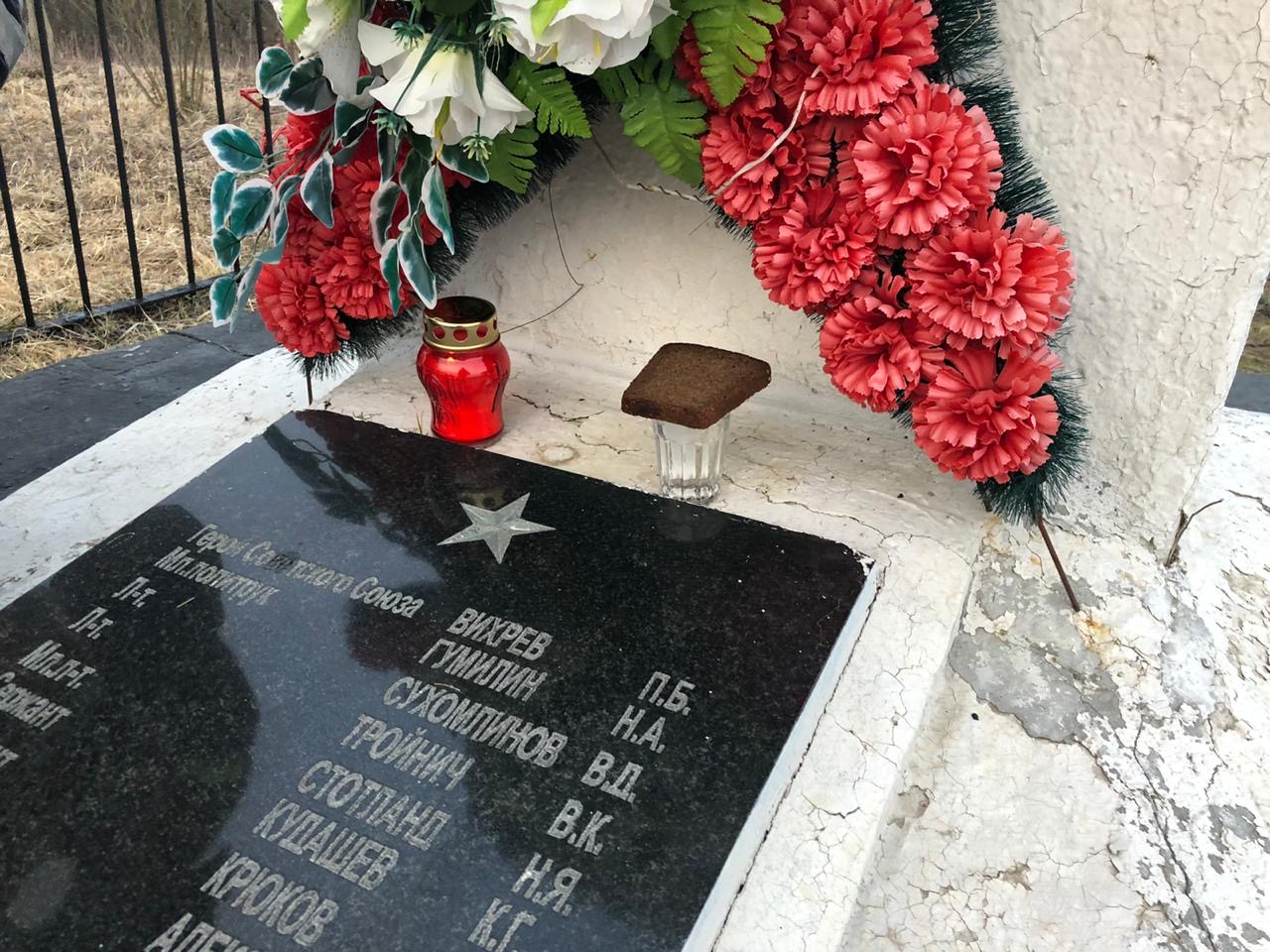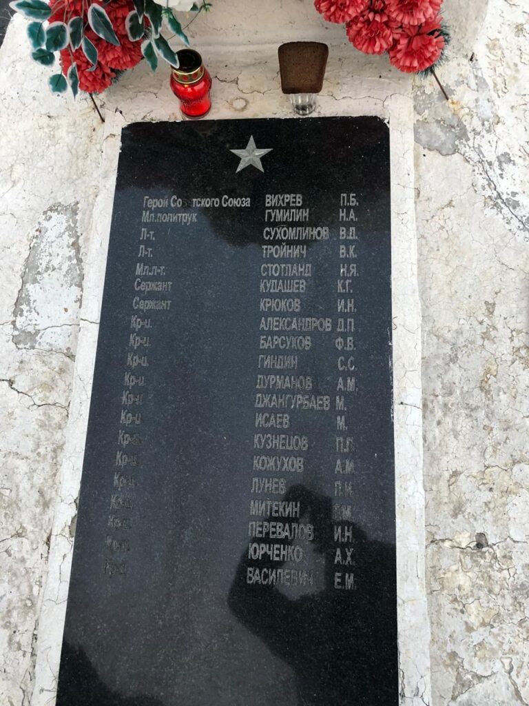 В этой братской могиле вместе со своими бойцами захоронен Герой Советского Союза политрук Вихрев Пётр Борисович — военный комиссар 6-й стрелковой роты 2-го стрелкового батальона 1075-го стрелкового полка 316-й стрелковой дивизии 16-й армии Западного фронта (род. 11 марта 1909 года в селе Чилик ныне Чиликского района Алматинской области Казахстана), кто с первых дней войны был призван в ряды Красной Армии.